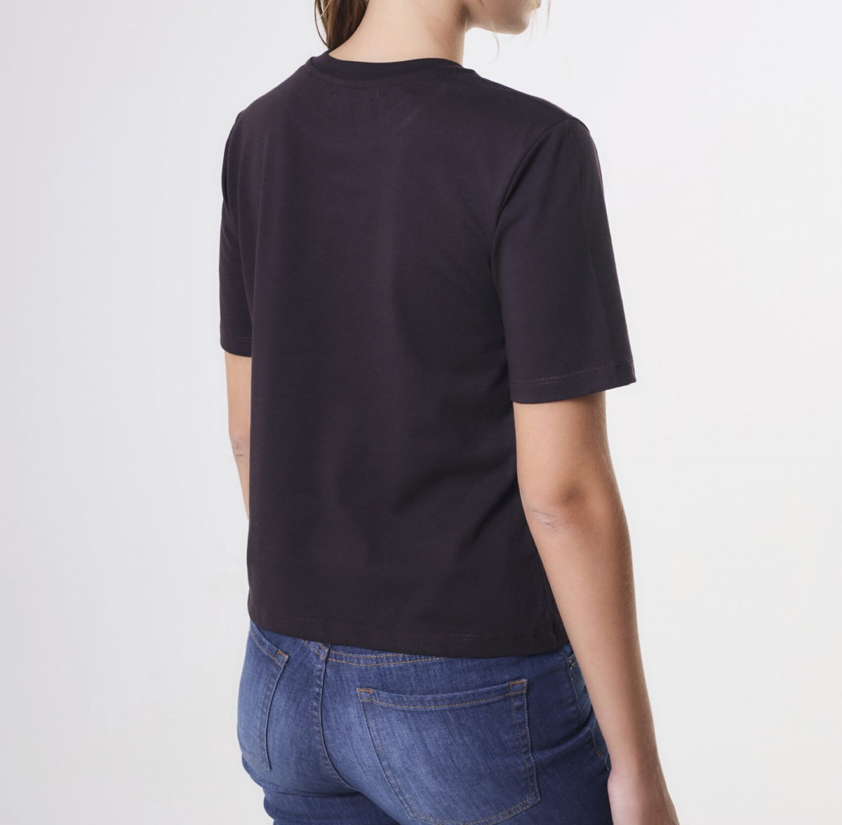 Remera de mujer calce relajado manga corta con cuello redondo con complemento en cuello. Confeccionado en jersey de algodón.