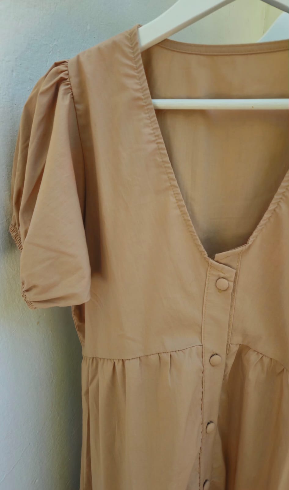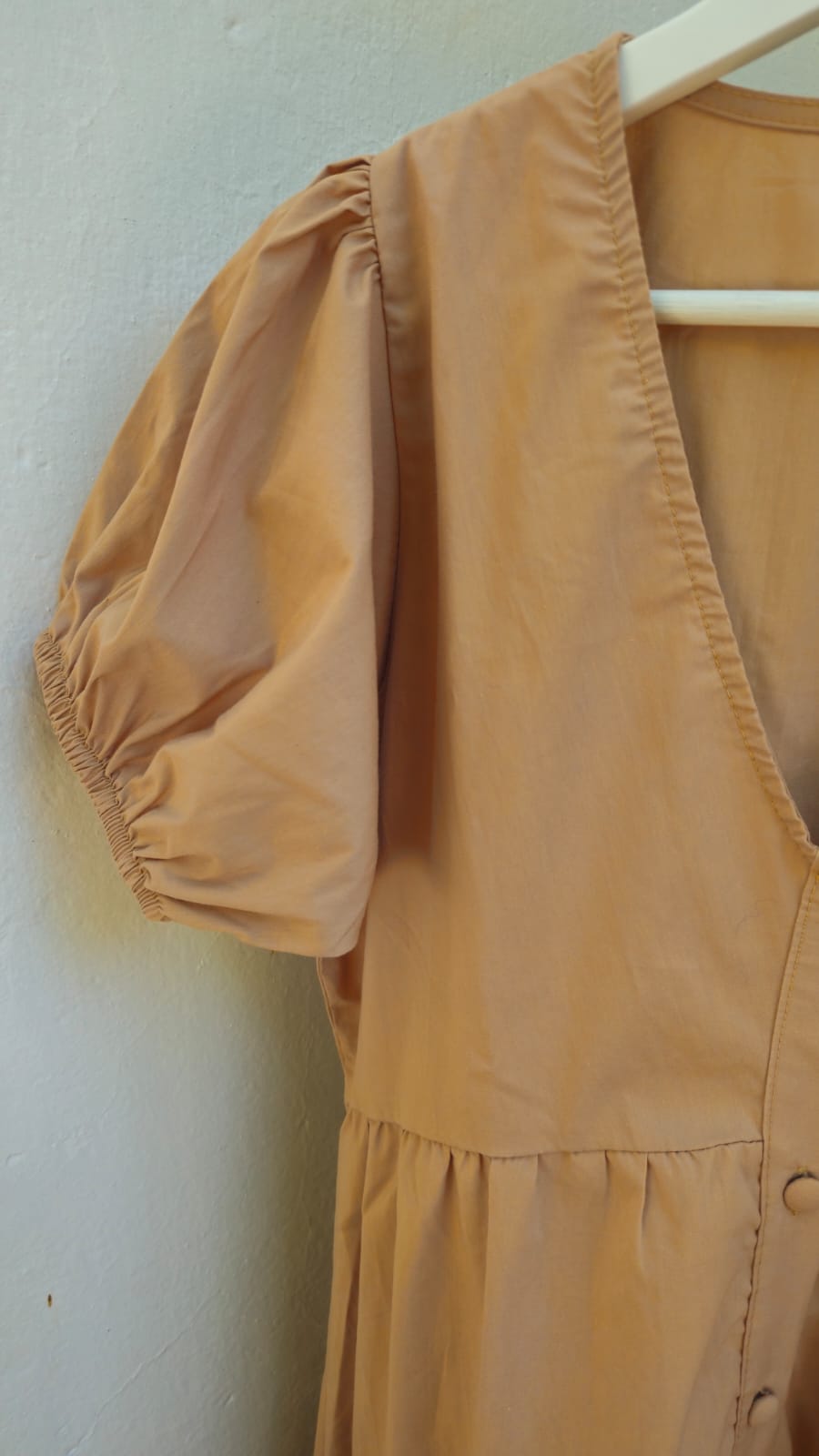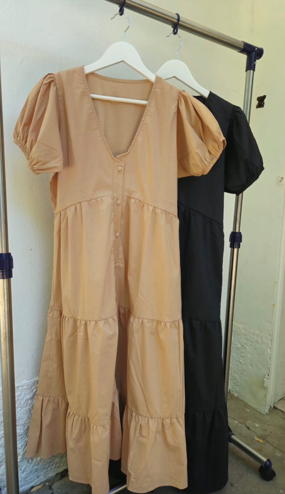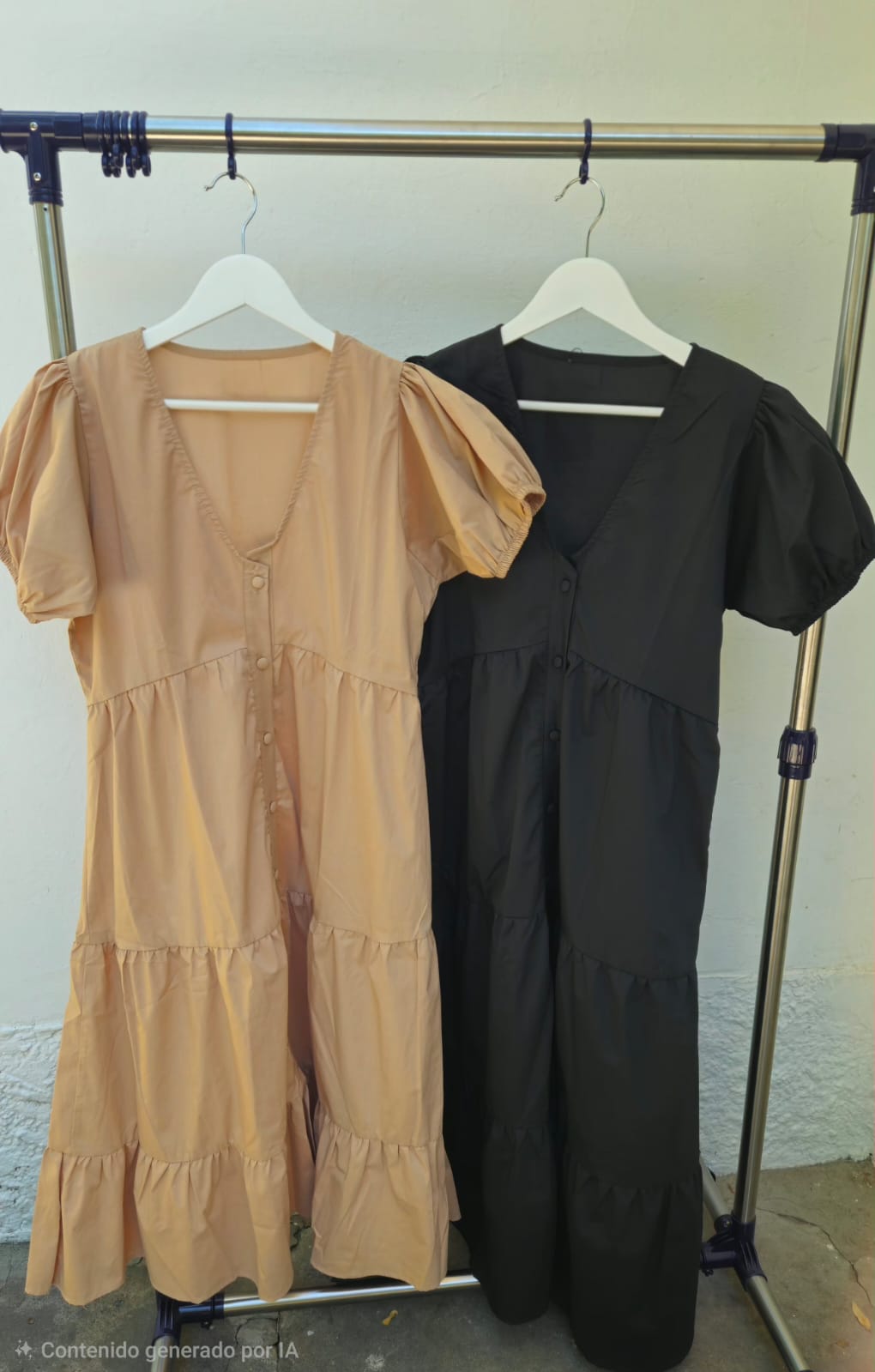 Vestido presenta dise帽o escalonado con volantes y una fila de botones forrados en la parte delantera,cuenta con mangas cortas abulladas lo que a帽ade un toque rom谩ntico y dr谩matico al dise帽o